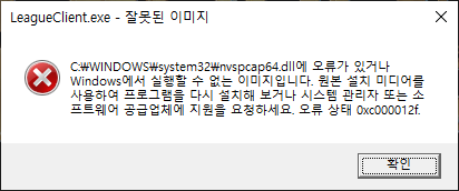 LeagueClient.exe 실행 시 C:\WINDOWS\system32\wpcap64.dll 파일이 손상되었거나